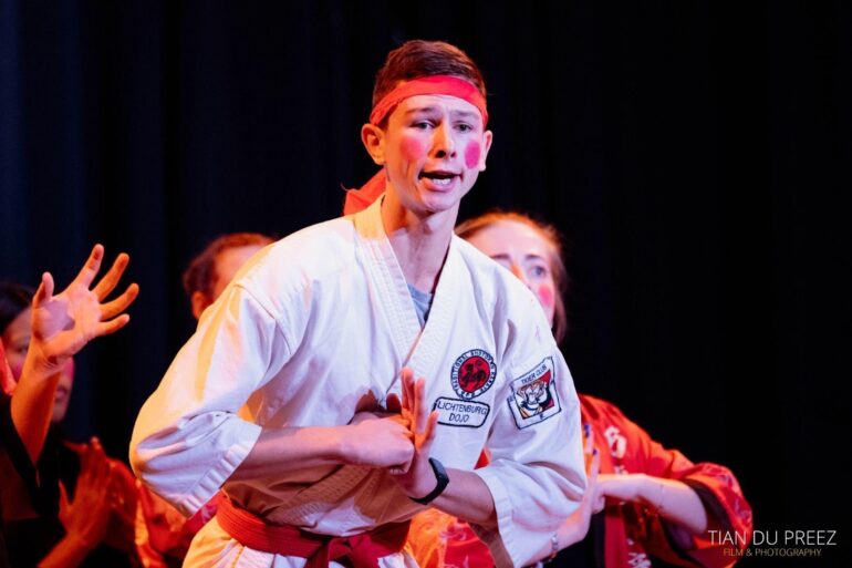 China het vanaf die eerste tree op die verhoog, die gehoor se aandag vasgevang. Die verhoog het meteens in ‘n dojo verander, waar ‘n sensei, ‘n ma en ‘n karate student, omring deur uniforme gekleë karakters, ‘n storie vertel het met skerp humor en uitstekende toneelspel wat die gehoor telkemale aan die lag gehad het. Die sang was uitmuntend – harmonieuse stemme het deur die saal gedruis, en die keurig gekose medleys was ‘n genot vir die ore. Met minimalistiese, maar tema-spesifieke bewegings het hierdie groep gewys dat minder soms meer is – en vir ‘n kort tyd, het hulle beslis die verhoog besit!