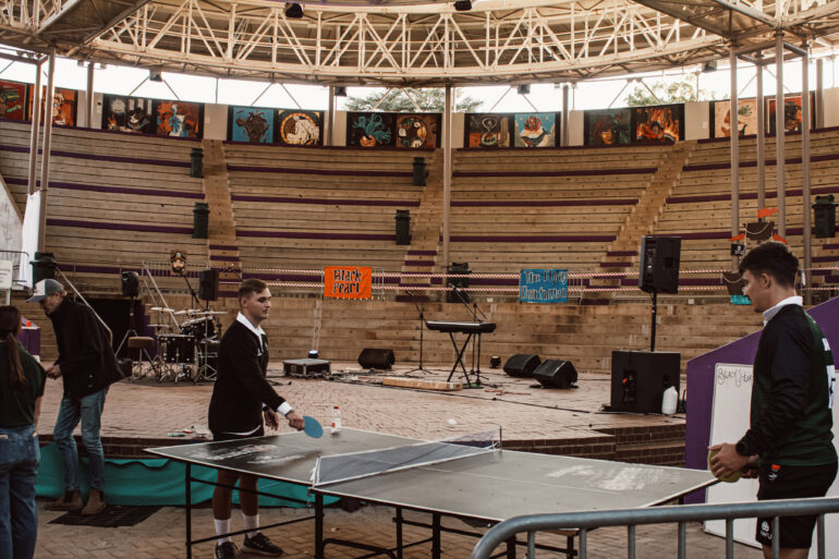 The treasury also organised with the bands, Veervol and Kerkstraat, to fill the Amphi with music. On 7 July, each residence was given a time slot between 11 p.m. and 4 a.m. to come to campus and cheer on their Prim, by singing their residence anthem. During this time the Prims were allowed out of their “prison” to sing with their residents.
