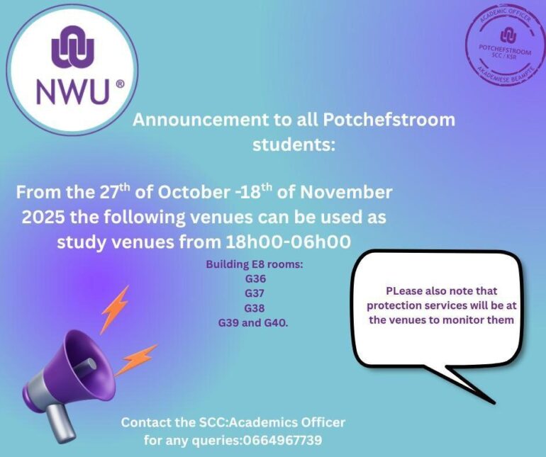 The NWU has once again implemented its quiet times rule, giving students designated timeslots during the day when they can study without distractions. This rule applies across residences, allowing students to review their academic work peacefully in their rooms. In addition, the university has established a campus-wide “no events” period, during which no actions or events may be held by any society or club within the NWU or on campus.