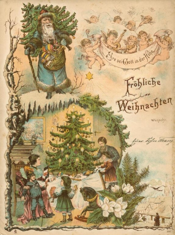 Image of a vintage German Christmas card featuring illustrations of a gift-bearing figure (similar to Santa Claus), angels, and a family gathered around a decorated Christmas tree. Translation: “Glory be to God in the highest”. “Merry Christmas”. “Wishes”. (Source: National Geographic).