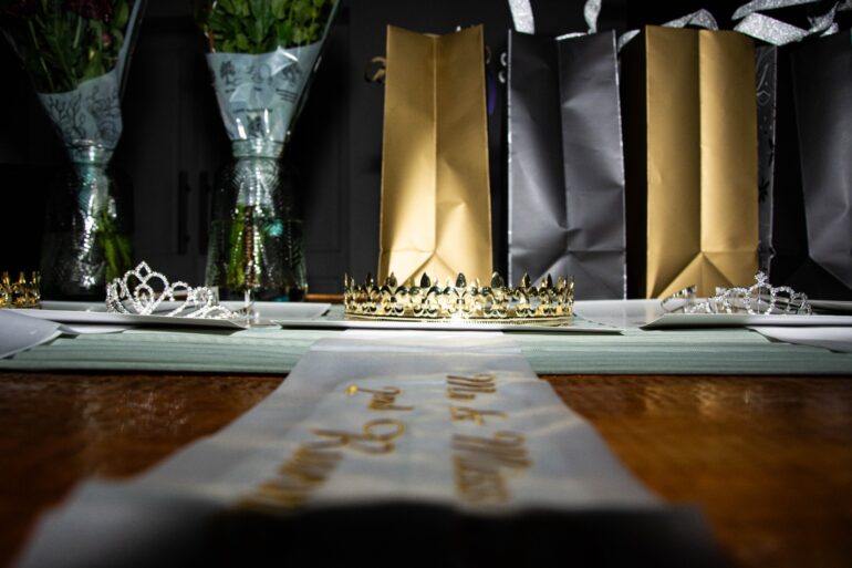 A black and two gold bags next to two flower bouquets behind various crowns and tiaras with two white sashes with gold lettering that respectively reads “Mr Pharmacy 2026” and “Ms Pharmacy 2026” in front of them (Source: Leya Bothma under Empire Photographer @jacobothmaphotograph).